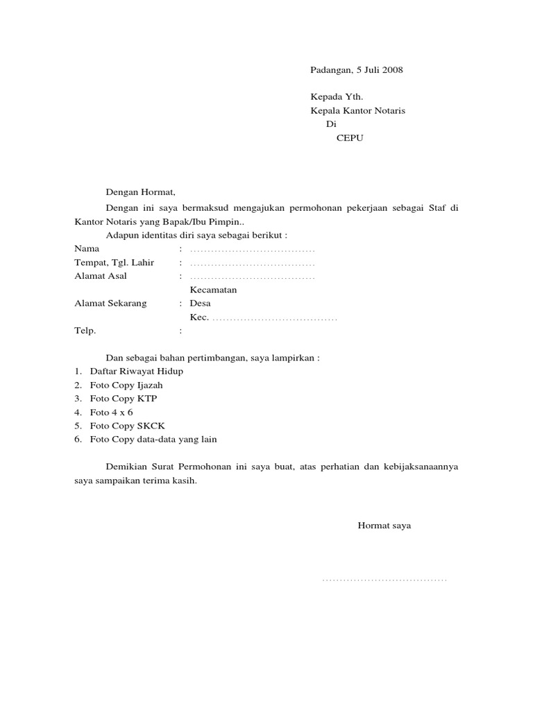 Dapat anda lihat bahwasanya di dalam contoh surat lamaran tersebut telah dicantumkan beberapa berkas berupa pas foto terbaru berlatar belakang merah 3 x 4 sejumlah 2 lembar, fotocopy ktp, fotocopy ijazah. Salah satu syarat yang diwajibkan perusahaan atau pemberi kerja adalah surat lamaran kerja. Dalam pembuatan surat lamaran kerja di pt anda harus menulis posisi yang sesuai dengan yang dibutuhkan pt tersebut. Tapi saya ingatkan kembali bahwa pada postingan saya sebelumnya. Saya akan memberikan contoh surat lamaran kerja yang baik dan benar + disukai hrd. Itulah beberapa contoh surat lamaran kerja di pt sebagai karyawan untuk berbagai posisi yang bisa anda gunakan, baik untuk umum, lulusan smk, sma, maupun sarjana. Contoh surat lamaran kerja di hotel. Contoh surat lamaran kerja yang baik dan benar job fair. Contoh surat lamaran kerja yang baik dan benar. Hotel menyediakan banyak lowongan pekerjaan bagi masyarakat terlebih lagi bagi mereka yang memang mengambil program pendidikan kehotelan. Diatas merupakan salah satu contoh dari surat lamaran kerja untuk di puskesmas. Kalau iya, maka kamu perlu surat lamaran kerja yang menarik untuk memikat hati pimpinanmu. Tuliskan juga nilai apa yang anda miliki.